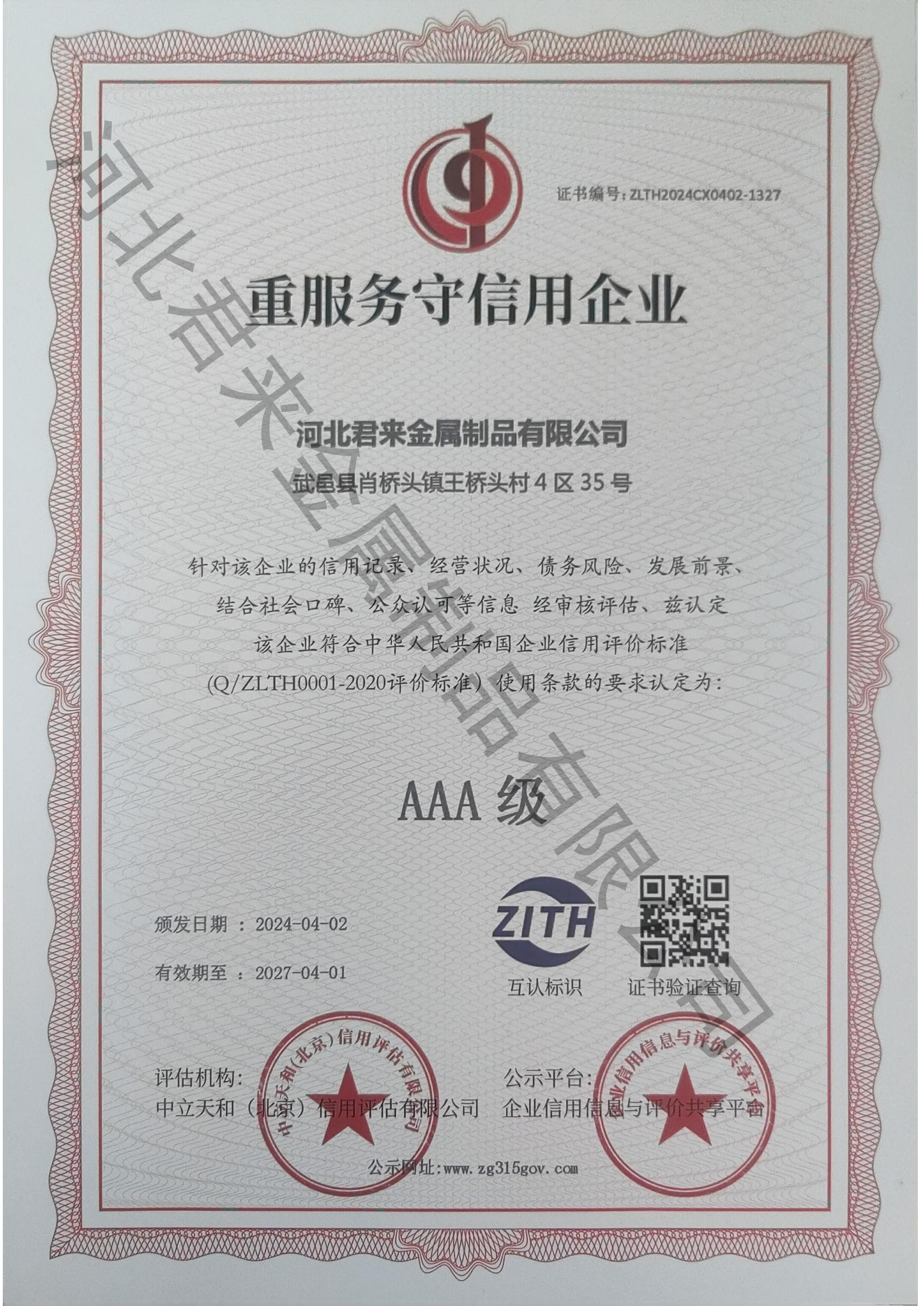 重服務(wù)守信用等級(jí)證書(shū)